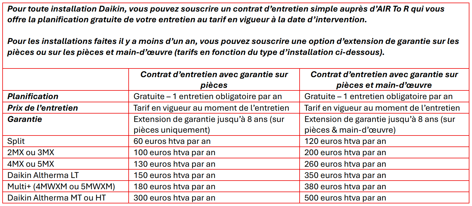 Tarif préférentiels possibles si plusieurs installations Air To R. Durée maximum conseillée entre 2 entretiens : 2 ans si vous nettoyez les filtres chaque année par vous-même. Ou chaque année si vous ne souhaitez pas assurer le nettoyage des filtres. Pour les installations comportant plusieurs unités extérieures, le forfait s'adapte comme suit : forfait le plus élevé + forfait(s) suivant(s) (sur autres installations Daikin à la même adresse) réduit(s) de 120 euros htva.